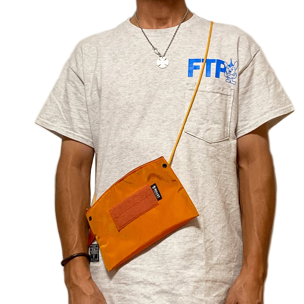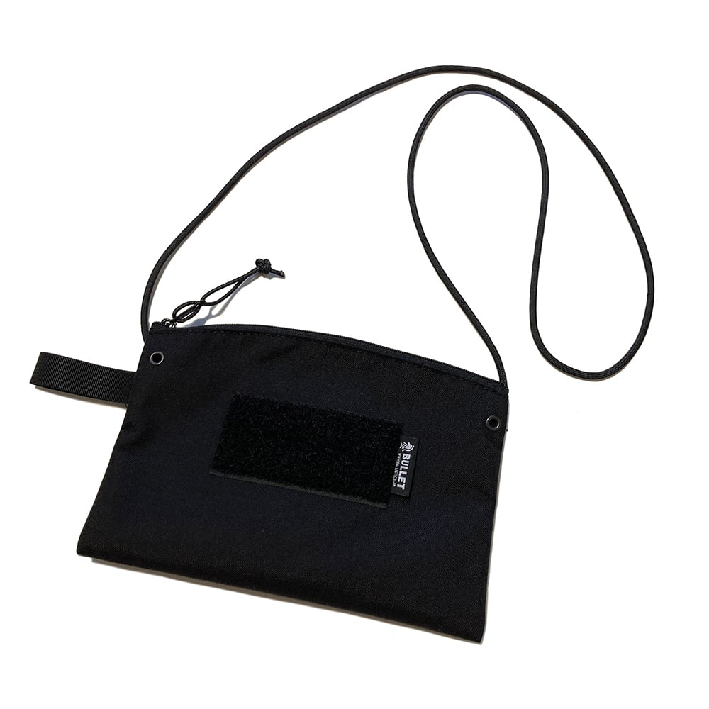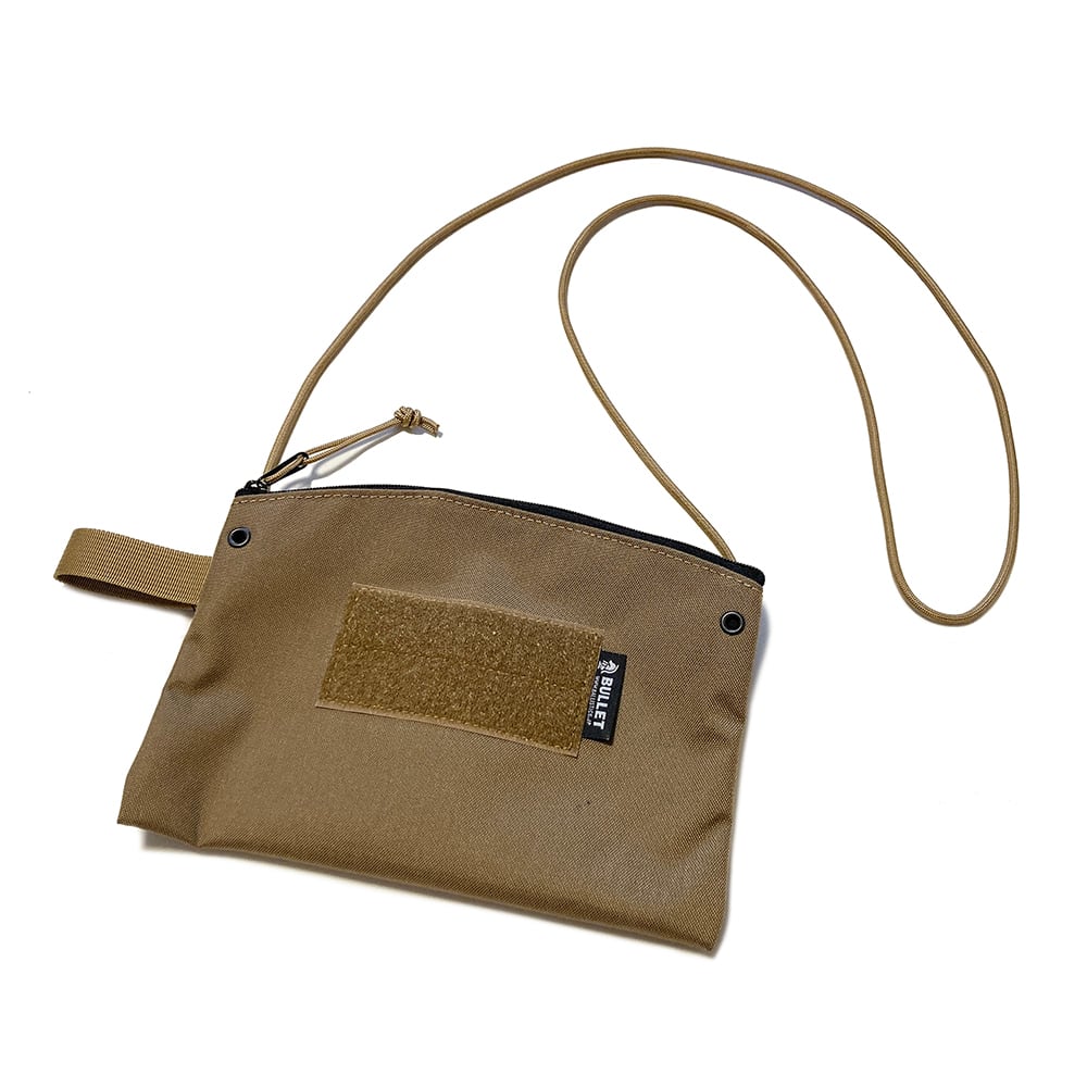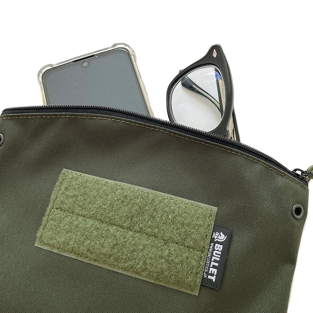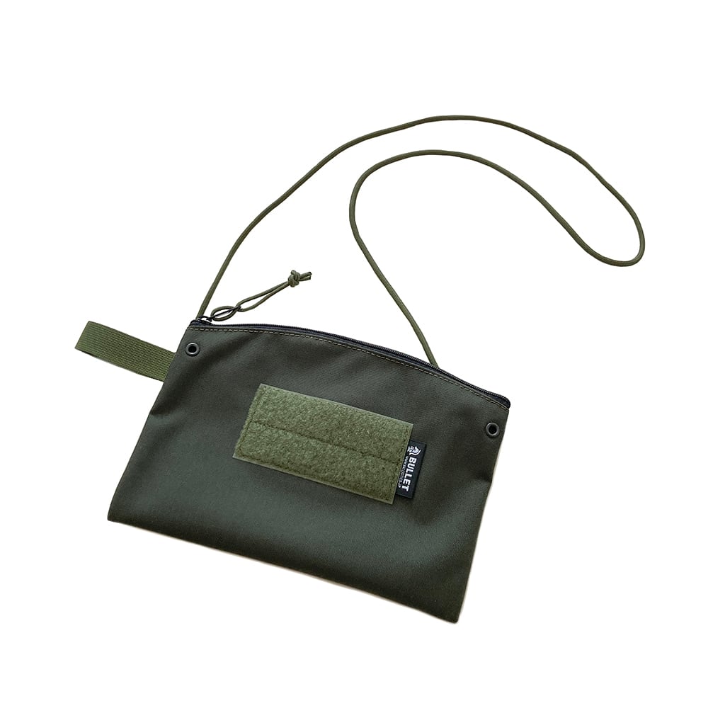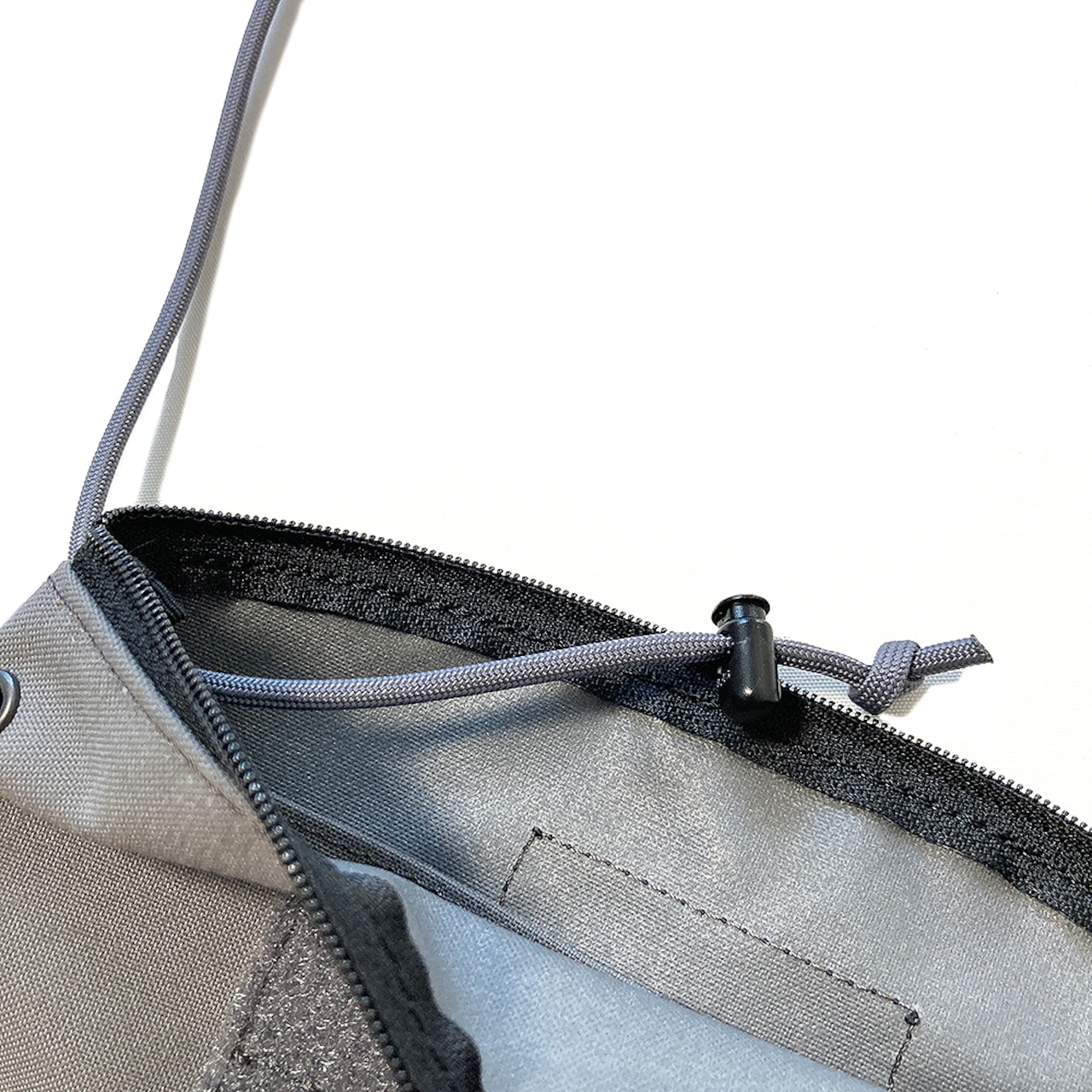 簡単な作りの四角形の平面ポーチで。ファスナー付辺だけ微妙にラウンドしています。喫煙具、メガネ、財布、スマホ、カギ等をまとめて収まるサイズです。又、税金や公共料金の支払い用紙や通帳を入れて銀行に行くにも便利です。手持ち用のテープループに加え両面に4ヶ所のグロメットホールを設てありまのでパラコードをお好みの面に通してベルクロベース面と弊社タグ縫い付け面の両方どちらも表面とてリバーシ ブル仕様で肩掛け頂けます。パラコードの長さは内部のストッパーで 無段階に伸縮するので短くすればハンドバッグの様に手持ちも可能です。