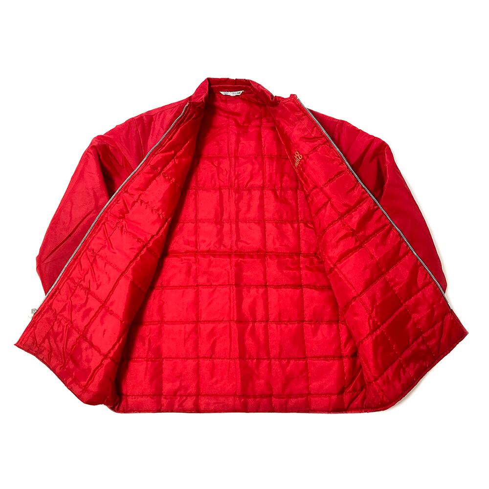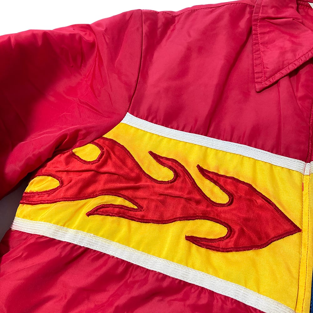 TALON ZIPの付いたキルティングレーシングジャケット!!まず一際目に飛び込んでくるファイヤーパターンの刺繍とREVELのチェーンステッチ刺繍が背面に奢られたオーラを感じるスペシャルな1着(^^)!!先に紹介したホットロッド刺繍のジャケットも凄かったですがこちらのジャケットも負けず劣らずな1品です!!なかなかこんなMOTOR系アイテムの古着は出てこないですよ!!特にVINTAGEは一期一会の出会いですのでサイズ合いそうな方は是非(^^)