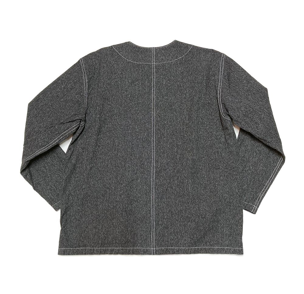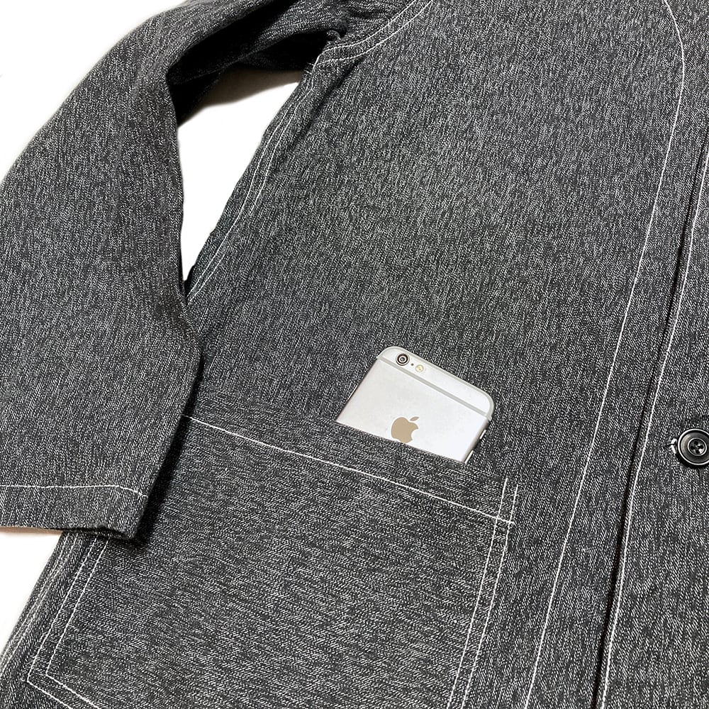 通称"ごま塩"と呼ばれている生地で製作した軽く羽織れるジャケット(^^)重宝する時期としては春と秋口ですかね!!写真のようにTシャツにも合いますしシャンブレーシャツやワークシャツ、ボタンダウンシャツなどの襟付きシャツを合わせてもハマります(^^)このジャケットの上にベストを重ねてもイイ感じですよ!!スタイリングひとつでワーク系もイケますし綺麗目なシャツを合せれば、ちょいシックな感じの着こなしも可能です。とにかくサラッと羽織れる1枚なのでオススメです。