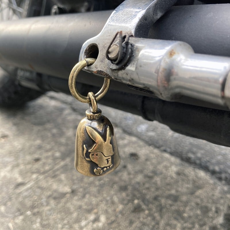 ベル本体にはウチのトレードマーク!?の一つになっているキャラクター"OUTLAW RABBIT"を採用!うさぎは世界的に縁起が良いとされているいますからね(^^)アメリカでもラビットフットという御守りが有名です。その反対側には"TRAFFIC SAFETY"(交通安全)の標語を彫り込んでいます(笑)まさに御守り感を増してくれますよね(^^)